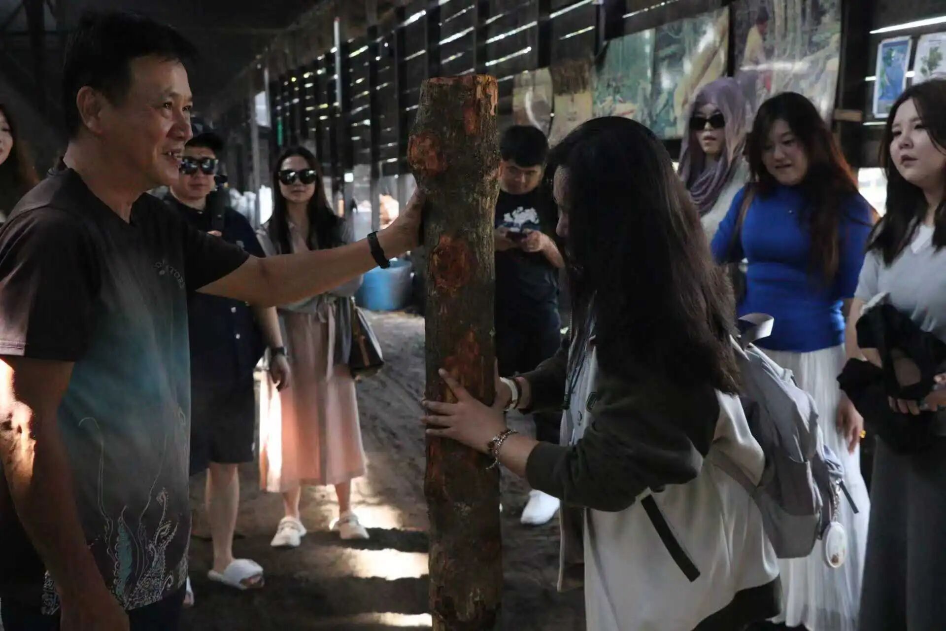 在红树林旁的炭窑场,师生们近距离观摩了红树林木材转化为火炭的传统工艺。从木材砍伐、切割分拣,到入窑熏烤、火候把控,每一道工序都依赖匠人的经验与坚守,没有固定的标准,全凭肉眼观察与嗅觉判断,这不仅是一门传统手艺的传承,更是当地人民顺应自然、因地制宜的生存智慧。